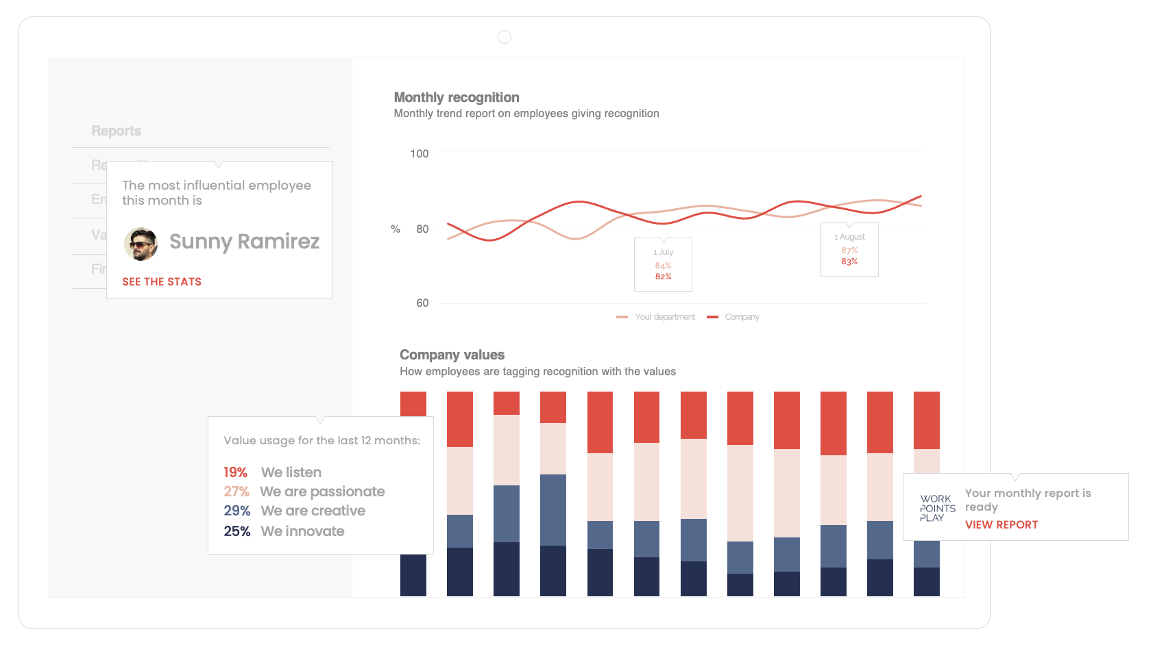 Our easily digestible dashboards mean you can spend your efforts analysing the recognition program, not struggling to make sense of disparate data sets.
