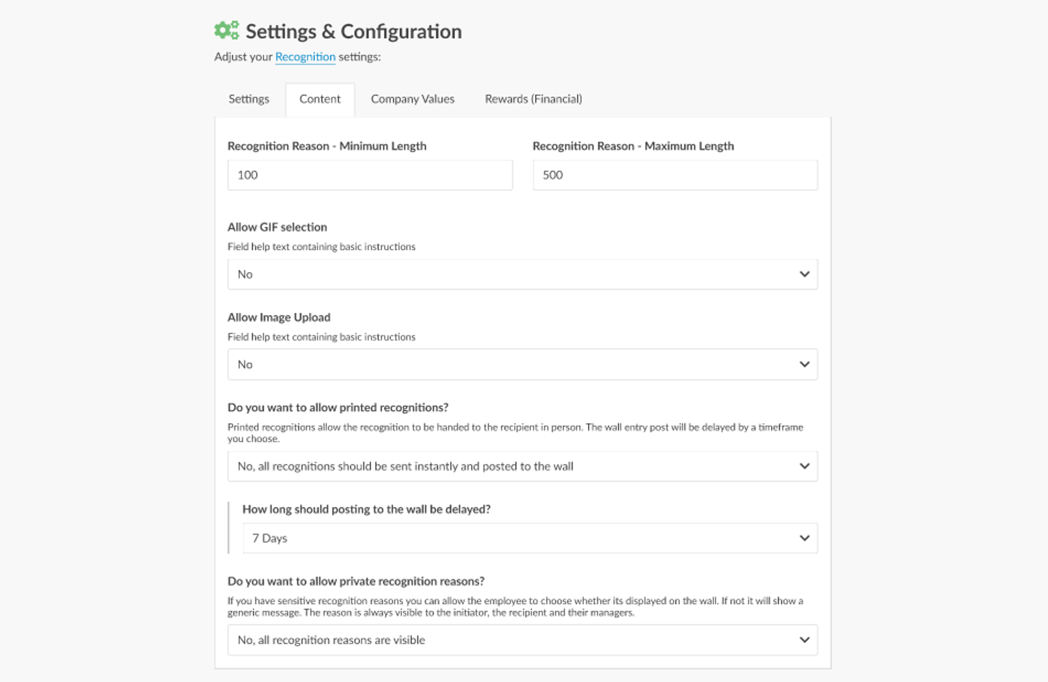 In addition to emojis, GIFs and images can be enabled. To give your employees the option to add GIFs or images, from the administration portal select Settings > Recognition > Configuration. To enable GIFs, select Yes in the Allow GIF Selection field. To enable images, select Yes in the Allow Image Upload field. These options can be enabled individually or concurrently.