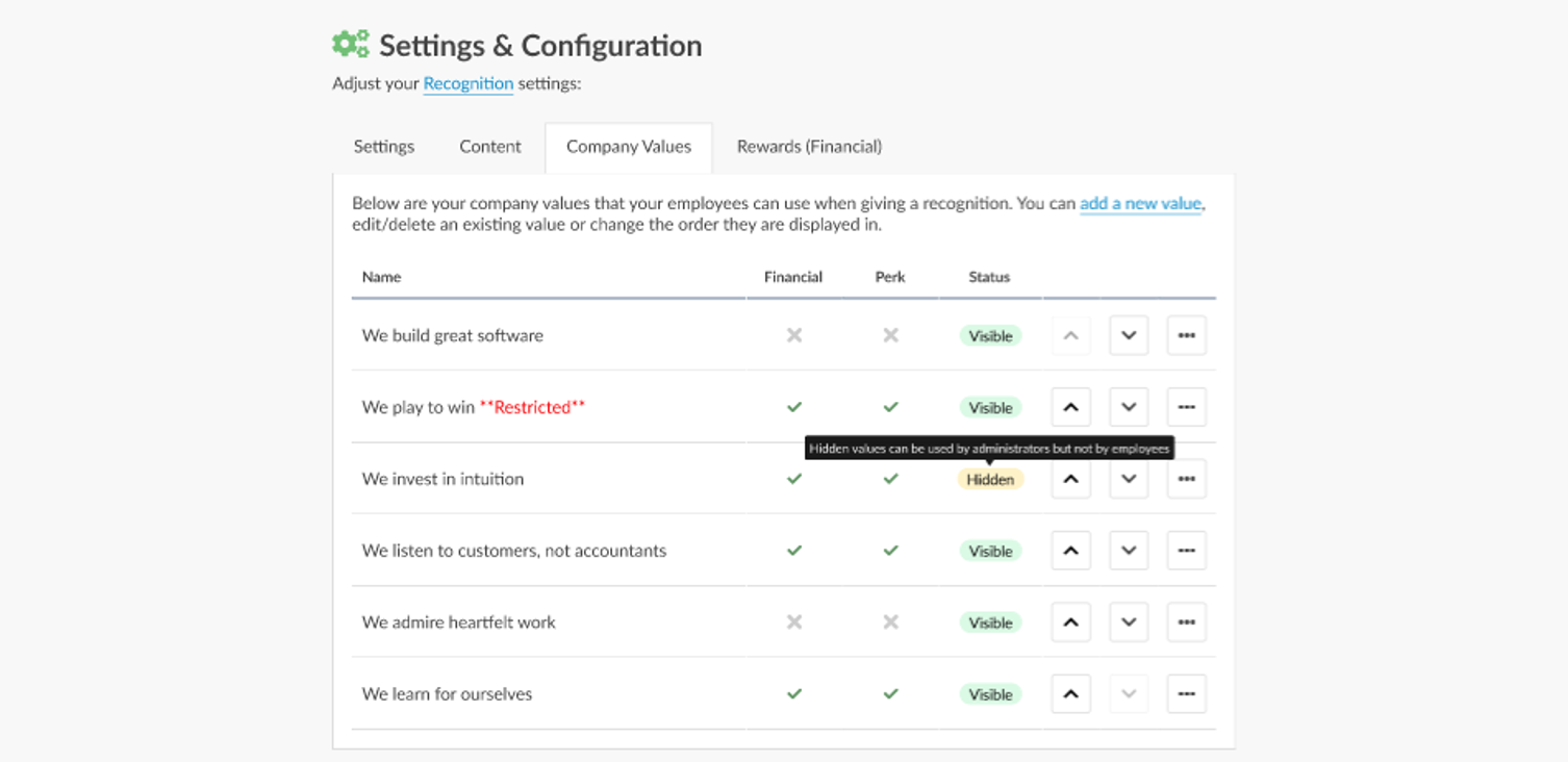 Company awards can have a reward/prize determined outside the program, added directly to the recipient’s recognition account or you can opt for no rewards: